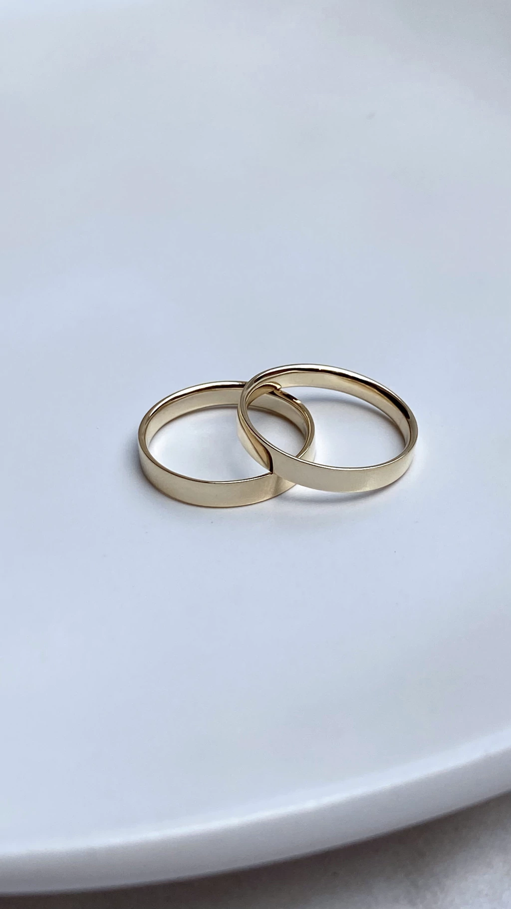 Par de alianças confeccionadas em ouro 10k maciço, acabamento polido e anatômica, para um conforto maior no uso diário.
